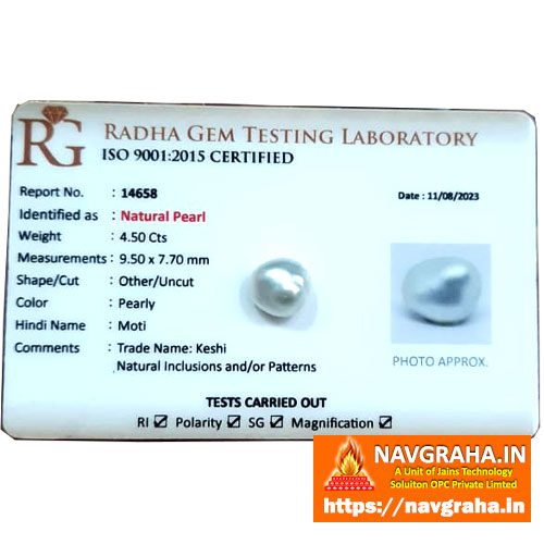 Discover the divine power of this exquisite 4.5 carat natural gemstone, meticulously selected and certified by our expert gemologists at Navgraha.in. This authentic Keshi showcases lustrous white appearance reflecting purity and serenity and represents the sacred energy of Moon in Vedic astrology.
