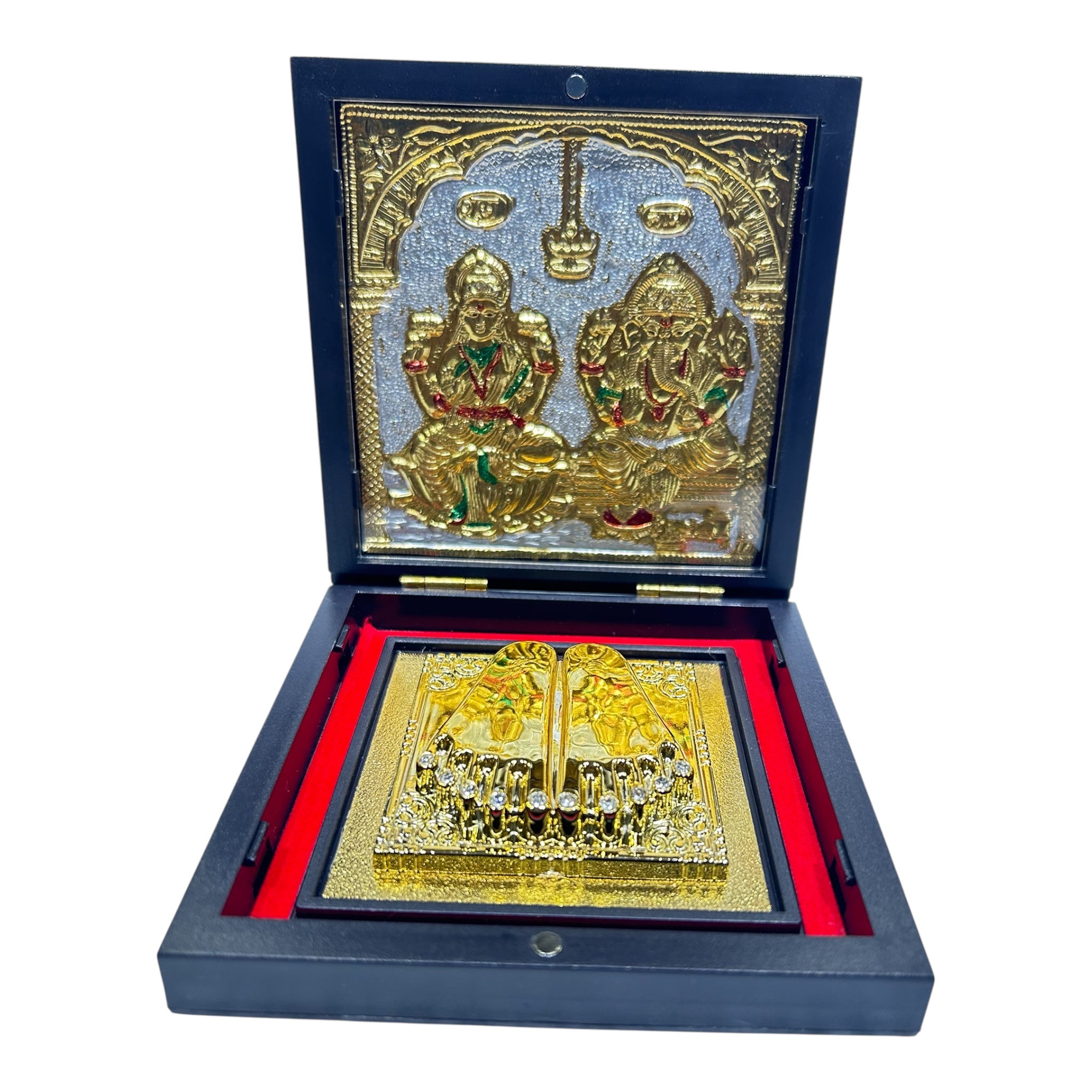 Sri Maha Lakshmi Ganesh Gold Plated Charan Box Corporate Gift 4 x 4 inch | Sacred Divine Footprints for Temple & Home